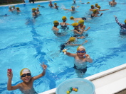子どもたちは水泳についての注意をした後、水慣れや水中にあるボール探しなどをしました。